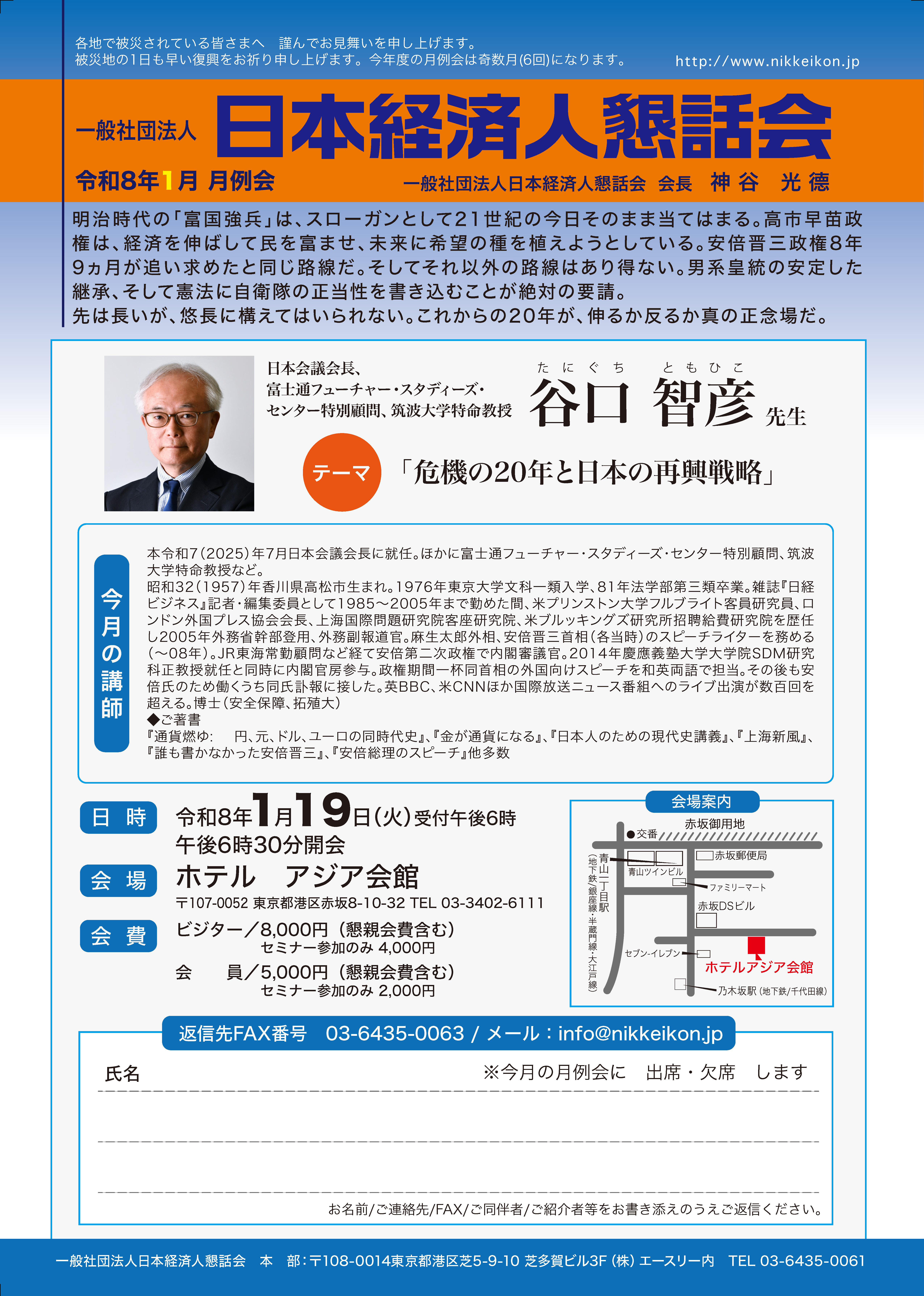 開催日は、第三月曜日(祭日の場合は火曜日)、会場はホテル・アジア会館で、変更なしです。